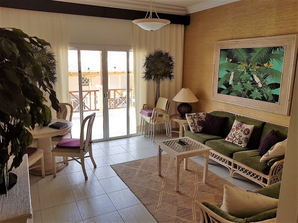 Tenemos en venta un chalet adosado de 2 dormitorios en el complejo Golf Resort con preciosas vistas al golf de Playa de las Américas.. Dispone de 87 m2 de interior y 43 m2 repartidas en 3 terrazas.. Distribuido en dos plantas.. La planta baja se distribuye en cocina, salón comedor, baño, trastero, lavadero y bonita terraza con vistas a las piscinas del complejo. En la planta alta encontramos un baño completo y 2 dormitorios dobles, los dos tienen terrazas privadas con vistas al golf y a la montaña.El complejo esta bien mantenido y es muy tranquilo. Tiene 2 piscinas comunitarias y zonas... Leer más