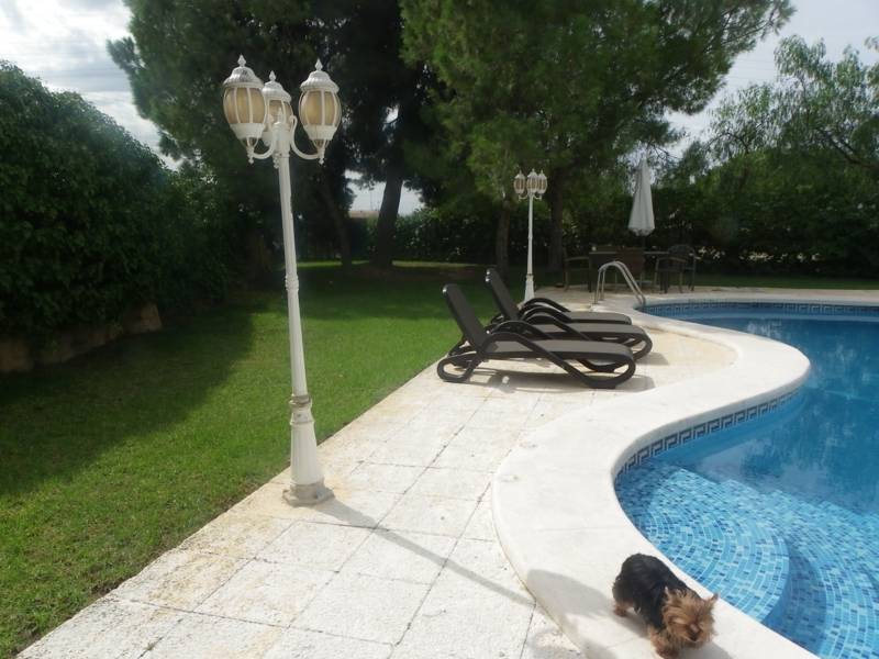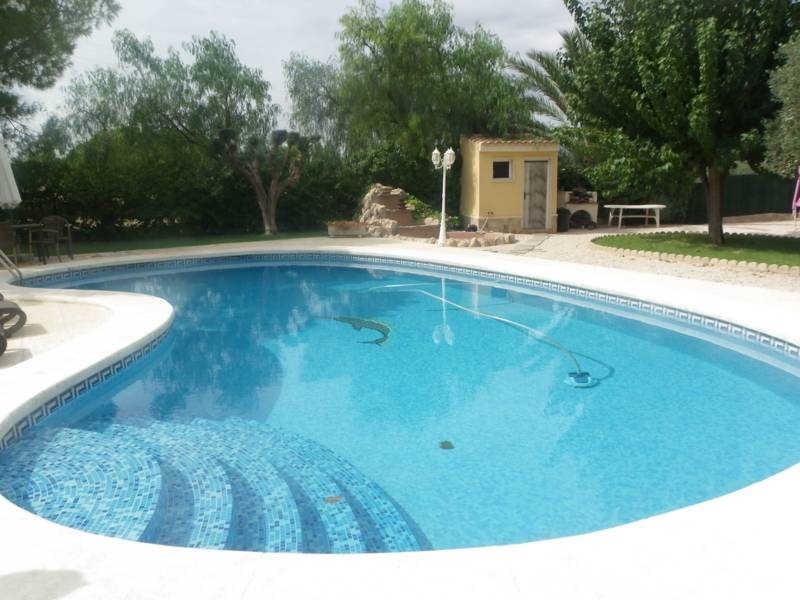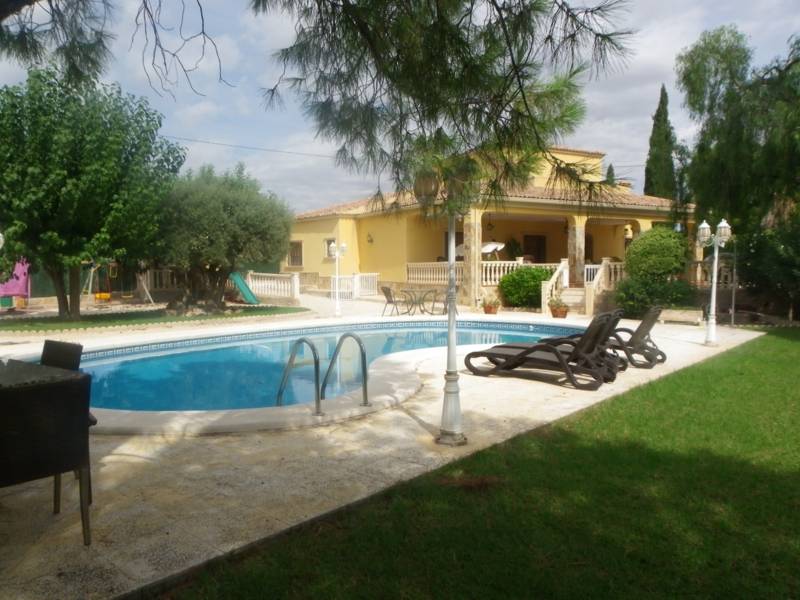 CHALET en Elche-Matola, a 3 km. de la ciudad, seminuevo, construcción del año 2005, parcela de 4.500 m2, ( de los cuales 2.000 m2 en parcela aparte con entrada independiente para utilizar en caso de pista de tenis, caballerizas, aparcamientos, etc.) el resto es parcela cercada y vallada con puertas automáticas , jardín, piscina privada, barbacoa techada y garaje cerrado o como trastero. La casa de muy buenas calidades y buena conservación tiene la carpintería exterior de aluminio imitando a madera y ventanas con rejas decorativas, tiene 2 plantas, la de arriba puede ser un segundo salón o sala de estar que podria utilizarse como dormitorio porque tambien tiene un baño completo y salida al solarium con vistas de unos 20 m2, Casi todas las dependencias se encuentran en la 1ª planta, un hall amplio con escalera a planta de arriba en hierro forjado muy decorativa. Salón comedor muy grande con chimenea, cocina también muy espaciosa con chimenea en esquina, con despensa independiente y otra zona de lavadero y plancha. En total 4 dormitorios con armarios empotrados a medida forrados y 4 baños completos. Tiene aire acondicionado de bomba de calor y frío en cada habitación, hidromasaje en alguno de los baños, 2 puertas acorazadas de entrada al chalet.. La porchada grandísima de 60 m2. Se vendería con electrodomésticos totalmente nuevos de ultima generación y los muebles a negociar en el momento de la venta pero se quedarían armarios por estar fabricados a medida.. BUENA OPORTUNIDAD DE CHALET SEMINUEVO MUY CERCA DE ELCHE CON CALIDADES !!!!