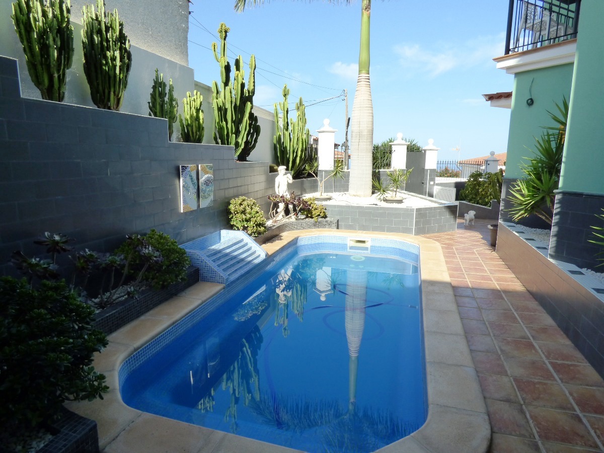 Espectacular Chalet en La Orotava - Las Cuevas. Propiedad de 305 m2 dividida en 3 plantas, entrada por 2 calles con doble garaje para 4 plazas. Planta principal con entrada por jardín, amplio salón-comedor, 1 aseo, cocina moderna independiente totalmente equipada con electrodomésticos de gama alta y pequeña terraza con vistas, 1 habitación doble con baño en suite con columna de hidromasaje. En la planta superior 2 habitaciones dobles con baño en suite y columna de hidromasaje, se accede a una gran terraza con vistas al Teide, Valle de La Orotava y al mar. En la planta baja con 2 habitaciones más o posibilidad de apartamento de huéspedes o despacho u oficina y con las instalaciones preparadas para montar otra cocina, otro baño completo, salida a terraza ajardinada con piscina climatizada y zona de barbacoa. Sótano con 2 garajes para 4 plazas con accesos separados, zona de lavadero con armarios y 1 aseo. Toda la propiedad construida con materiales de primera calidad, en impecable estado, iluminación con última tecnología LED interior y exterior, espectaculares vistas, muy luminosa, totalmente amueblada con excelente mobiliario, muy bien decorada, zona muy tranquila y cerca de conexión con autopista norte. No puede perdérsela!!! Venga a visitar la casa de sus sueños!!!. . Precio de venta: 551.000 euros (impuestos, gastos notariales y de registro no incluidos en el precio).